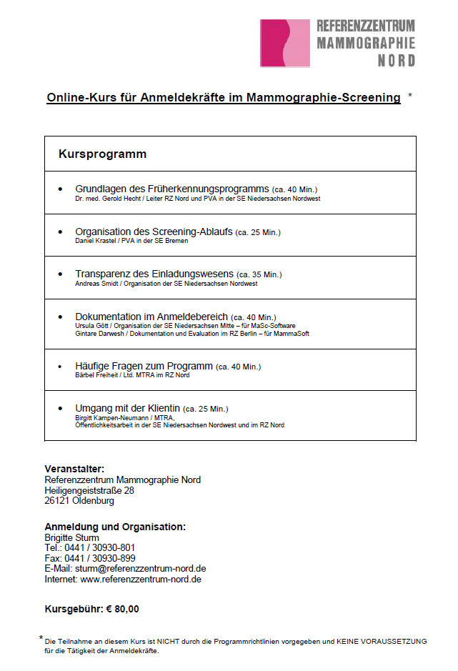 Übersicht der Einstiegskurse am Referenzzentrum Mammographie Nord